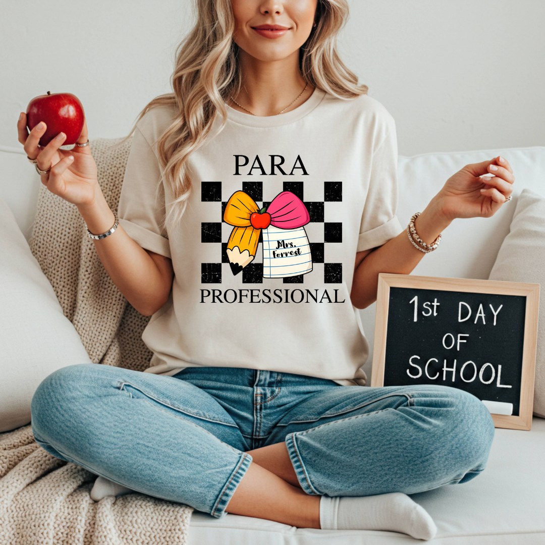 Celebrate the start of a new school year in style with our Back to Class Para tee! Designed just for paraprofessionals, this shirt features a playful checkered background, colorful bow and pencil accents, and a spot to personalize with your name. It’s the perfect blend of fun and functional—great for the first day and beyond. Soft, comfy, and classroom-ready, it’s a must-have for every dedicated para who brings heart and help to the school day.