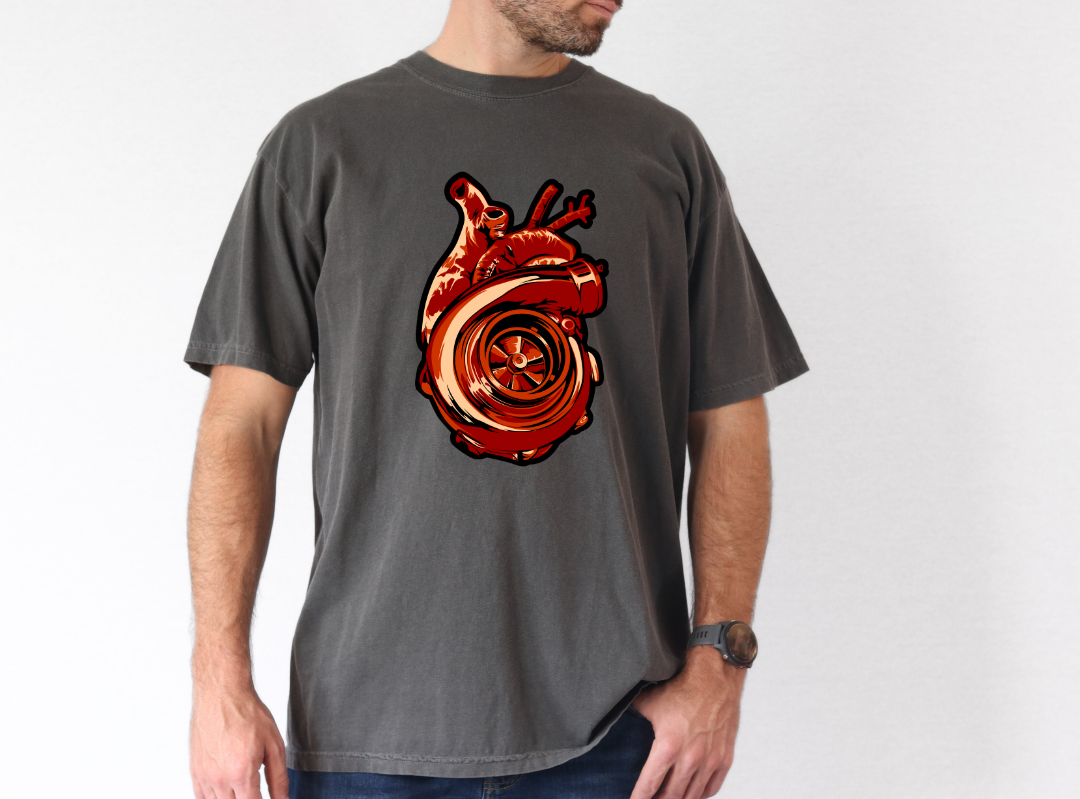 For those who live life at redline and feel every beat through a turbo spool. Boosted Pulse is a high-octane tribute to the gearheads whose hearts don’t just pump blood—they pump boost. With a design that fuses human passion and machine power, this tee is made for drivers, tuners, and dreamers who know that real love is measured in PSI.