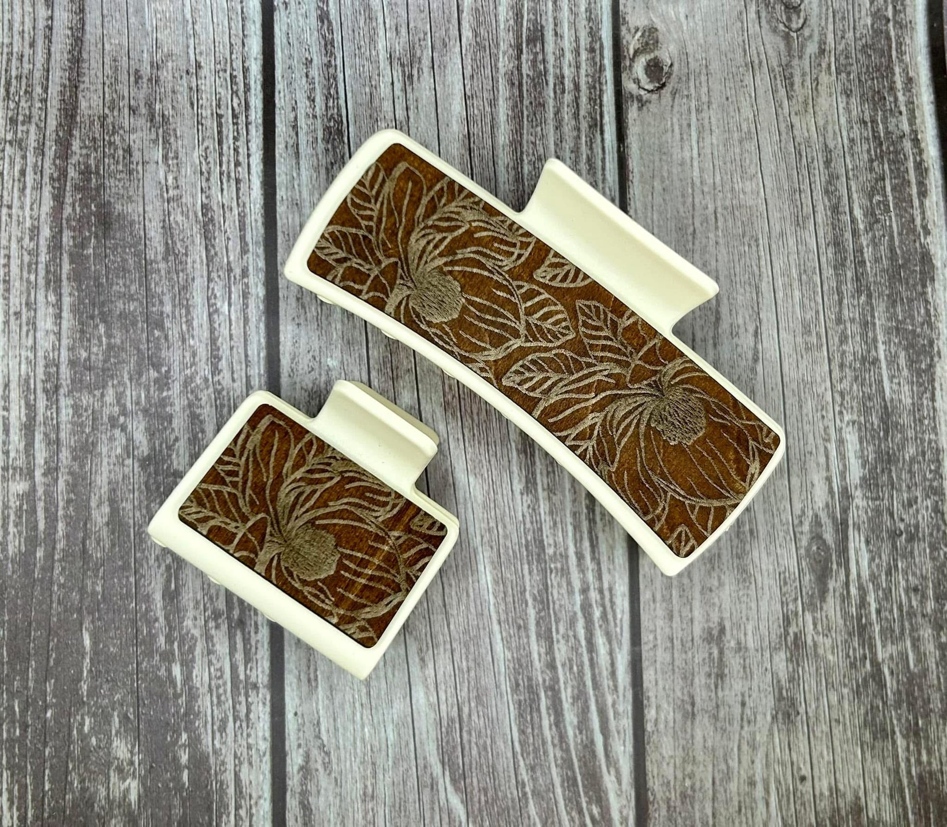Bring a touch of nature to your everyday style with our Botanical Bloom claw clip set. Featuring a beautifully detailed floral design, each clip is crafted from wood and laser engraved for a look that’s both earthy and elegant.