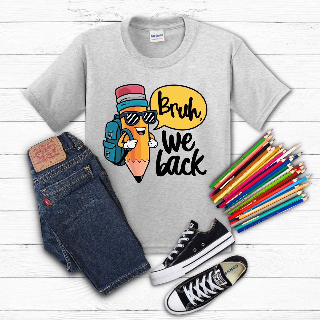 📝 Bruh, We Back is the ultimate back-to-school statement tee! Featuring a too-cool-for-school pencil rocking shades and a backpack, this shirt brings all the chill vibes and first-day confidence. Perfect for kids who are ready to roll back into class with swagger and style! 😎📚
