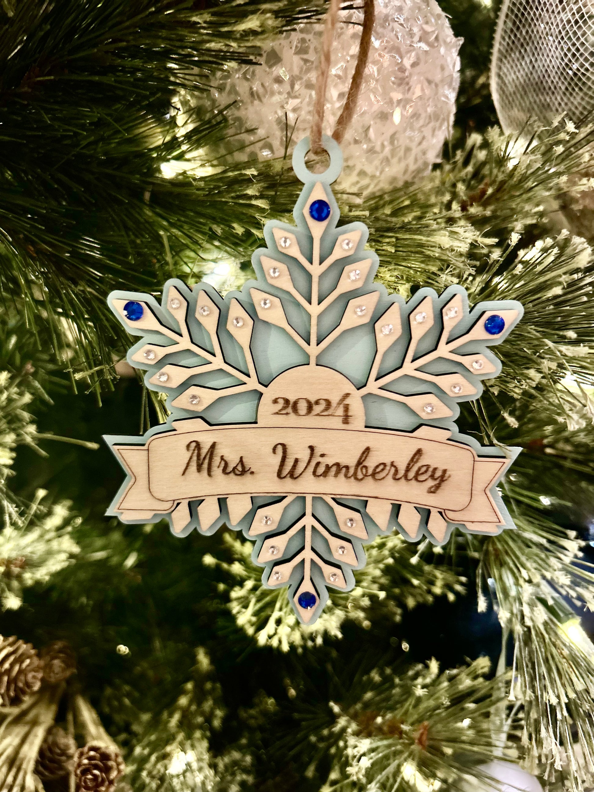 This custom laser-engraved, hand-painted ornament is the perfect blend of elegance and personalization. Shaped like a delicate snowflake and accented with sparkling gems, each piece is carefully crafted with your chosen name and year. A heartfelt keepsake for teachers, friends, or loved ones, the Crystal Nameflake shines bright on any holiday tree.