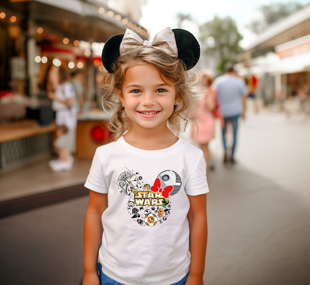 A perfect blend of galaxy-sized adventure and theme park magic! Force of Fun brings together adorable Star Wars icons and Disney charm in one playful design. With droids, troopers, and a splash of mouse ears, this tee is made for little rebels ready to rule the parks (and the galaxy) with a smile.