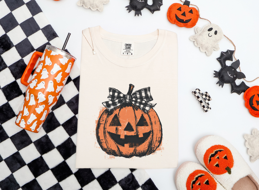 Bring a touch of cozy charm to spooky season with the Harvest Glow tee. Featuring a smiling jack-o’-lantern topped with a chic black-and-white plaid bow, this design perfectly blends rustic autumn vibes with Halloween spirit. Soft, stylish, and festive, it’s the perfect tee for pumpkin patch trips, fall gatherings, or simply sipping cider in spooky style.