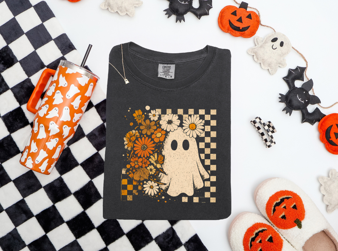 Spooky meets groovy with the Haunted Blooms tee! Featuring a vintage-style ghost surrounded by retro daisies and warm autumn florals, this design blends eerie charm with a touch of boho flair. Perfect for fall lovers who adore both Halloween vibes and a throwback aesthetic, this tee is cozy, stylish, and hauntingly cute. Whether you’re headed to a pumpkin patch, fall festival, or just channeling those retro spooky feels, Haunted Blooms is the ultimate seasonal staple.