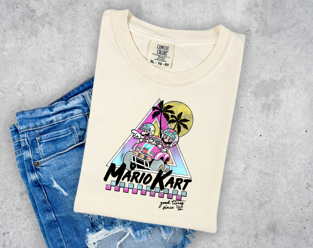 Start your engines and hit the beach! 🏝️ With Mario and Luigi cruising through palm-lined tracks in classic retro style, this tee brings the sunshine, speed, and nostalgia all in one. Whether they're racing to the ice cream stand or zooming through their imagination, kids will love the vibrant colors, vintage vibes, and tropical twist. Perfect for little racers with big dreams!