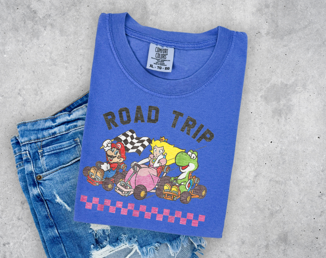 Ready, set, cruise! The Kingdom Kart Cruise tee puts your favorite kart-racing heroes on the fast track to fun. With a bold checkered border and colorful characters in action, this shirt brings high-speed adventure straight from the Mushroom Kingdom. Perfect for road trips, race days, or just cruising through the day in style—because every kid deserves a first-place finish!