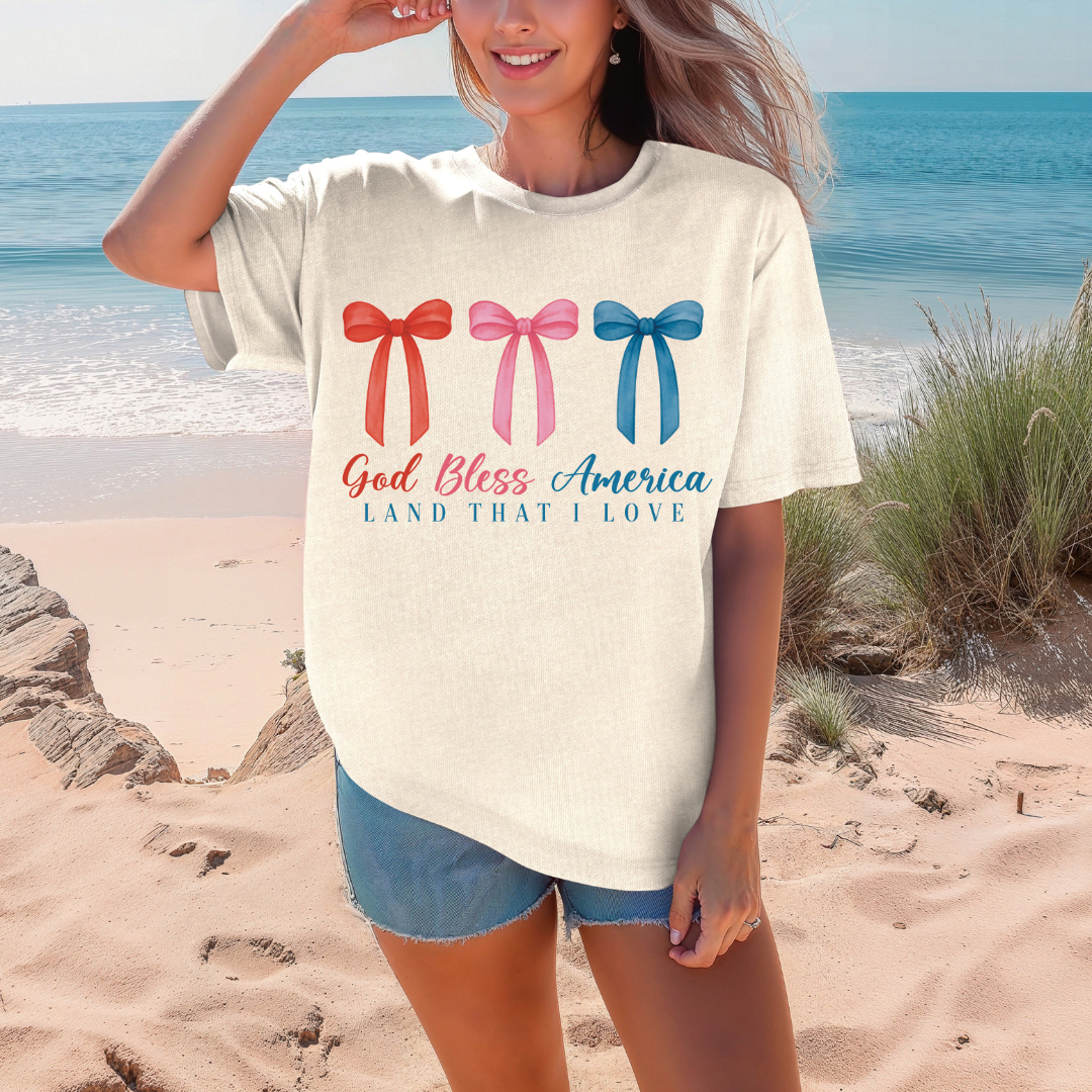 Show your love for faith, freedom, and femininity in our “Land That I Love” T-shirt — a soft and charming design that blends patriotism with grace. Featuring delicate red, pink, and blue bows and the beloved phrase: