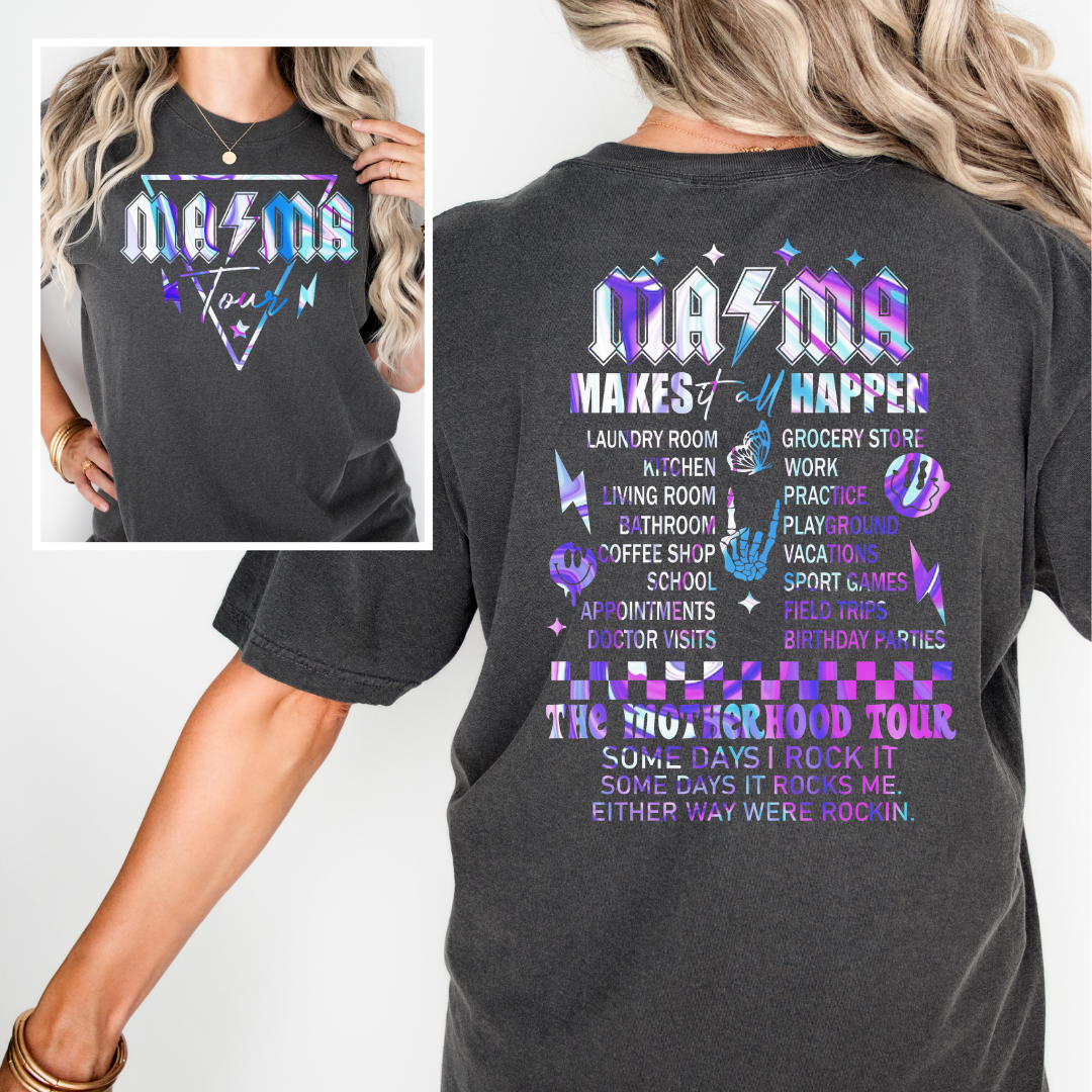 Introducing the Mama Tour tee ā for the woman who does it all and makes it look easy. The front features a bold "Mama Tour" logo, inspired by vintage band tour shirts. Flip it over, and the back proudly lists her daily ātour stopsā ā from breakfast duty to bedtime stories, showing the world who really runs the show.