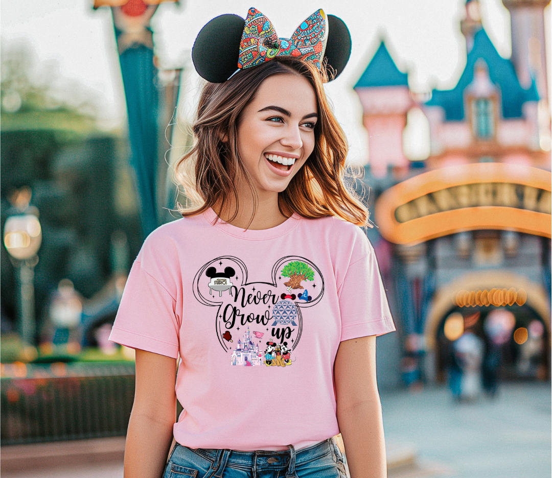 Embrace the magic, the memories, and the mouse ears with Never Grow Up! Featuring icons from all four parks, this tee is a tribute to the kid inside every Disney lover. Whether you're riding coasters, meeting characters, or chasing fireworks, this design reminds us all that growing up is optional when you're living the dream.