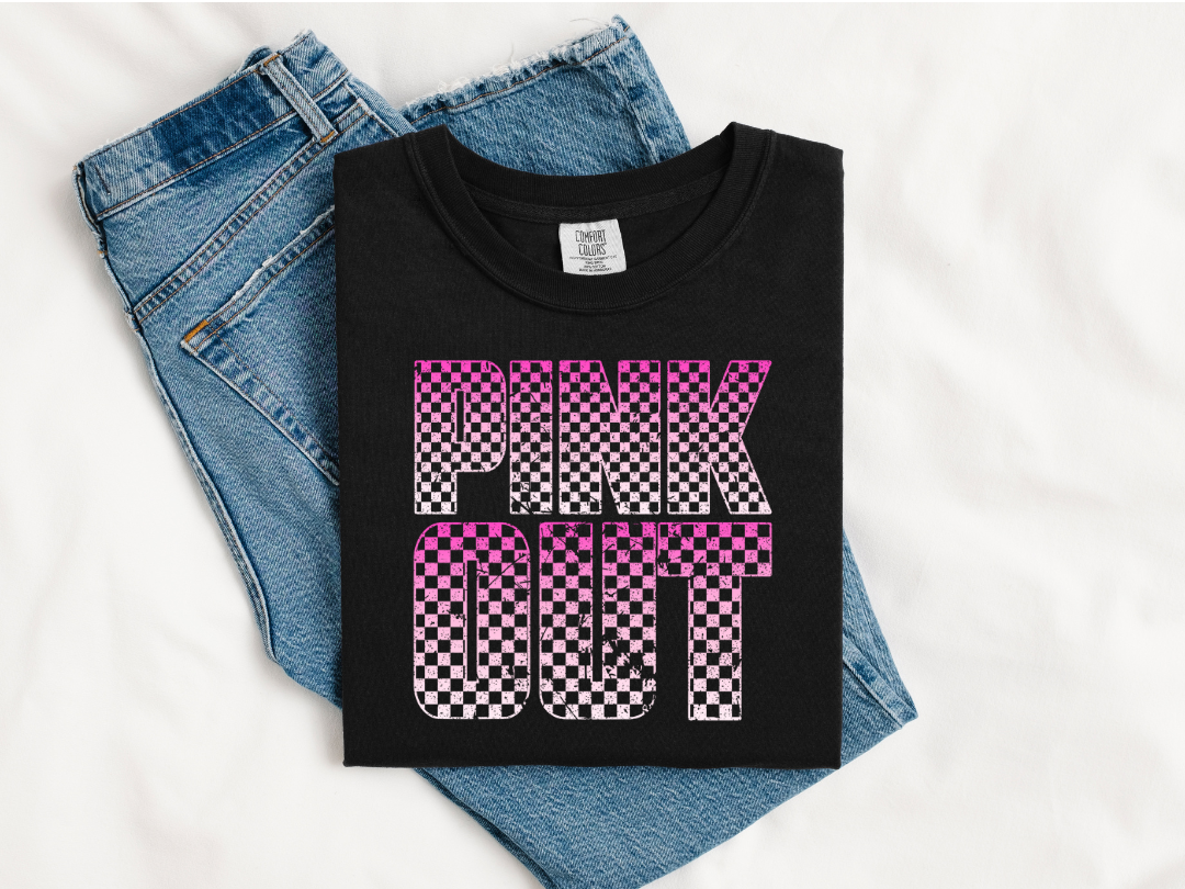 Stand out and show your support with our bold Pink Out tee. Featuring an eye-catching pink-and-black checkerboard design, this shirt is perfect for game days, spirit events, and Breast Cancer Awareness month.