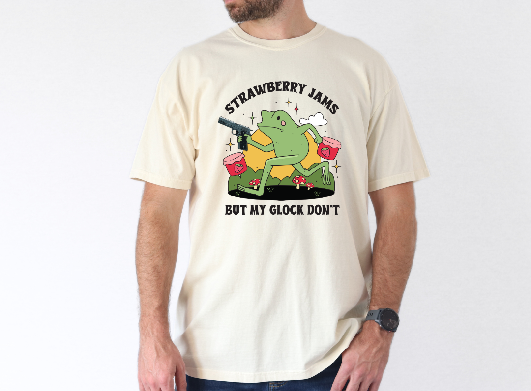 The Strawberry Jams shirt is where cozy meets unhinged. Featuring an oddly adorable frog caught between a jar of strawberry jam and a Glock, this design hits different—just like the phrase: “Strawberry jams, but my Glock don’t.” It’s perfect for fans of absurd humor, weird-core vibes, or anyone who likes their sweet with a side of spicy. Ribbit and ready.