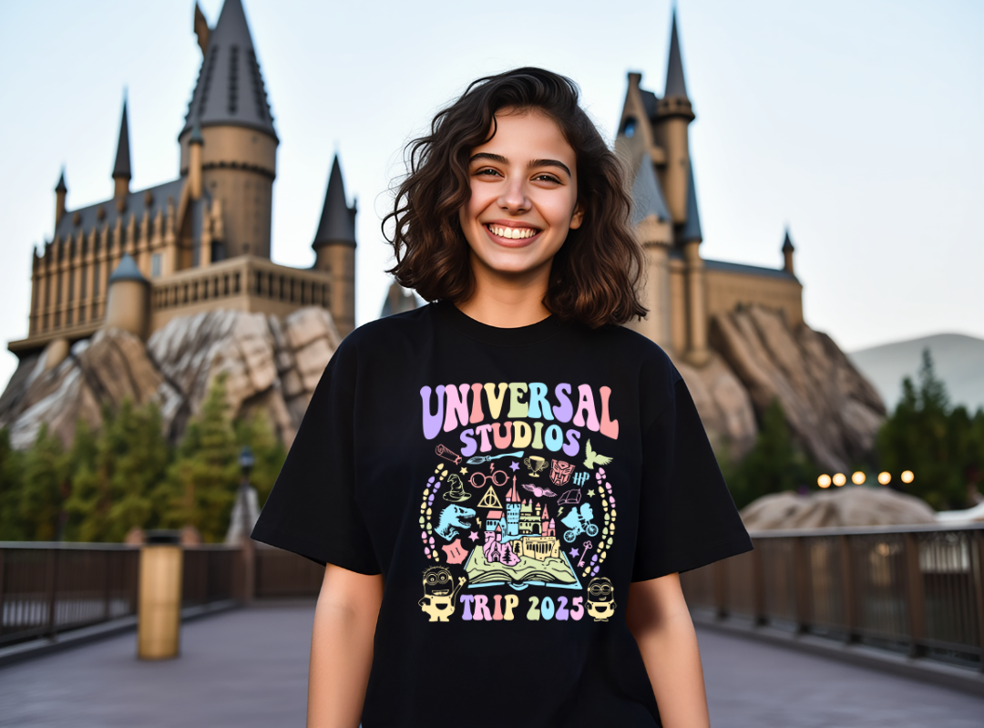 Lights, magic, and a whole lot of wonder—Studio Spellbound captures the colorful energy of your 2025 Universal adventure! From wands to wild rides, this tee is perfect for anyone who believes every great trip should come with a little spellbinding fun. A must-have souvenir for fans of thrills, fantasy, and unforgettable memories!