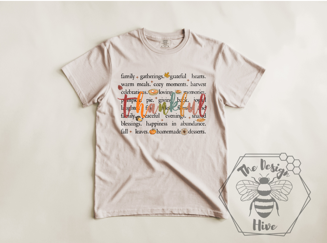 Celebrate the beauty of gratitude with our Thankful Words Tee — a cozy reminder of everything that makes this season special. Featuring a collage of heartwarming fall words like family, gatherings, blessings, and pumpkin pie, with “thankful” beautifully highlighted in autumn tones, this tee captures the true spirit of the season.
