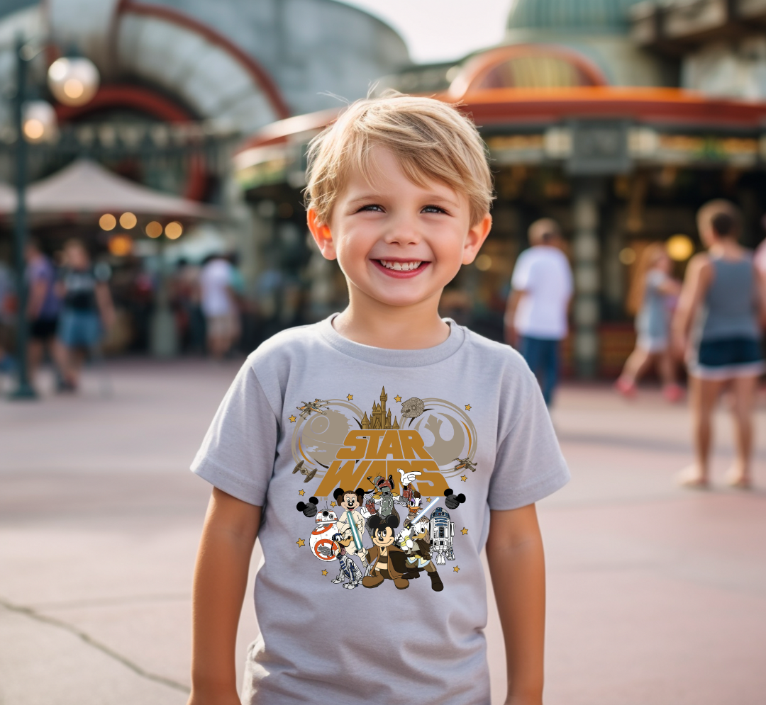 Join forces with the ultimate dream team—where Disney magic meets Star Wars adventure! This shirt features your favorite iconic characters reimagined as Jedi, rebels, and droids, ready to bring the fun to a galaxy not so far away. Perfect for park days, movie nights, or any fan of both worlds.