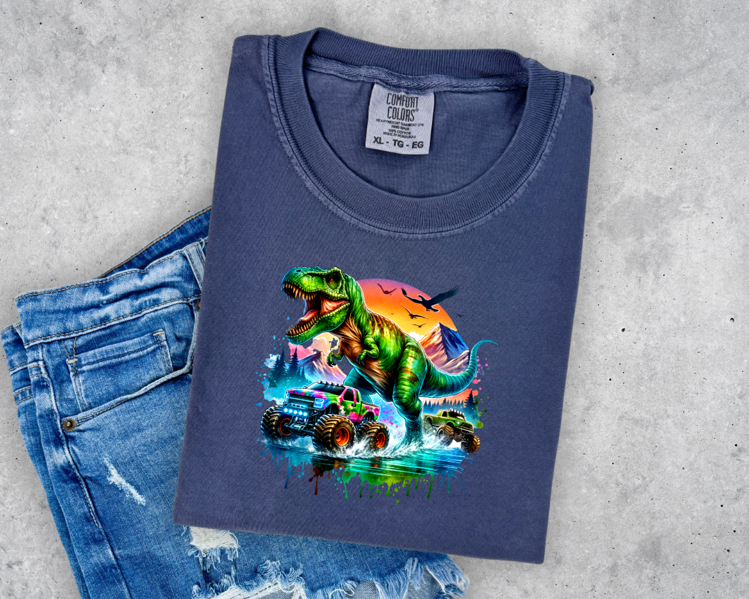 Roar into action! The Truckasaurus t-shirt mashes up two kid favorites—dinosaurs and monster trucks—into one epic adventure. With bright colors and a dino-powered truck splashing through water, this tee brings big energy and even bigger fun. Perfect for little explorers who love to stomp, splash, and drive their imaginations wild!